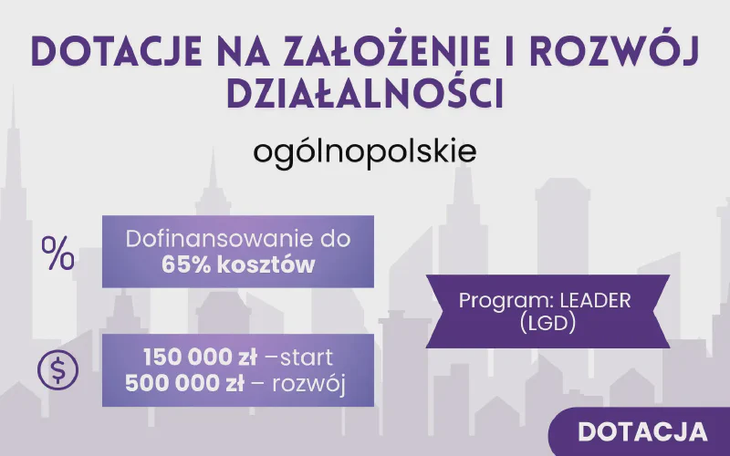 - Ile: wysokość dotacji określa LGD; min. 50 000 zł, zwykle do 150 000 zł (założenie) i do 500 000 zł (rozwój); do 65% kosztów kwalifikowanych.